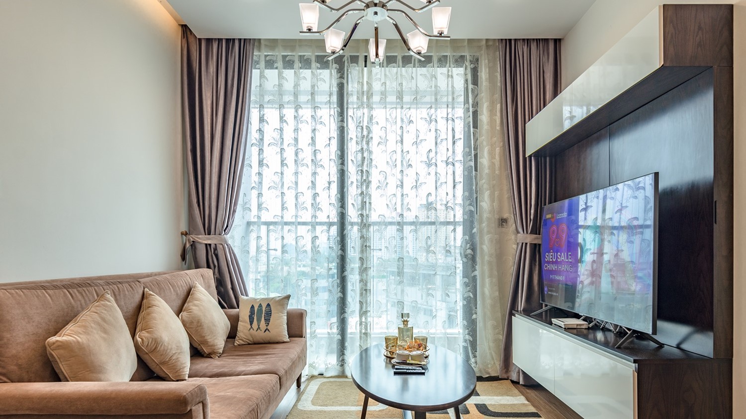 The apartment features a beautifully embroidered Vietnamese painting by the dining area, adding a touch of traditional charm and artistic flair to the modern décor. The living room is tastefully designed with ornamental lighting and decor that creates a warm and inviting atmosphere. The warm color palette and carefully selected furnishings give the space a homely feel, making it perfect for unwinding after a busy day.