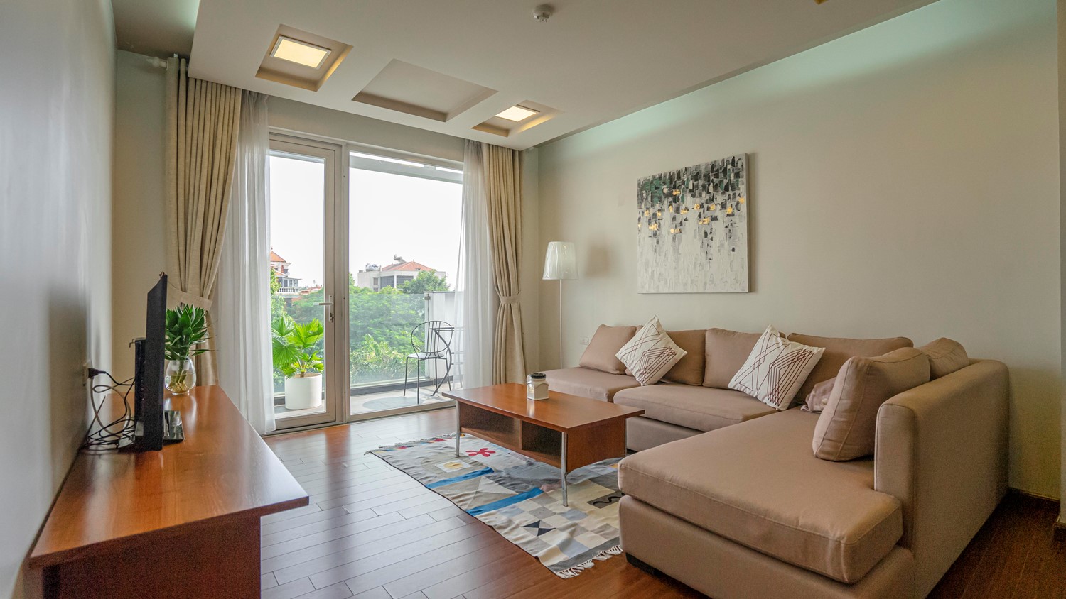 Nestled in a peaceful and slow-paced neighborhood on Quang Khanh Street, this charming 2-bedroom apartment offers a cozy and tranquil living experience in Tay Ho. With 90m² of thoughtfully designed space, this apartment features beautiful wooden accents that create a warm, inviting atmosphere. The living room has a comfortable layout that leads out to a charming balcony. There is a separate single-wall kitchen, which is well-equipped for cooking. Adjacent to the kitchen is a snug laundry area with a 2-in-1 washer and dryer, providing added convenience and practicality.