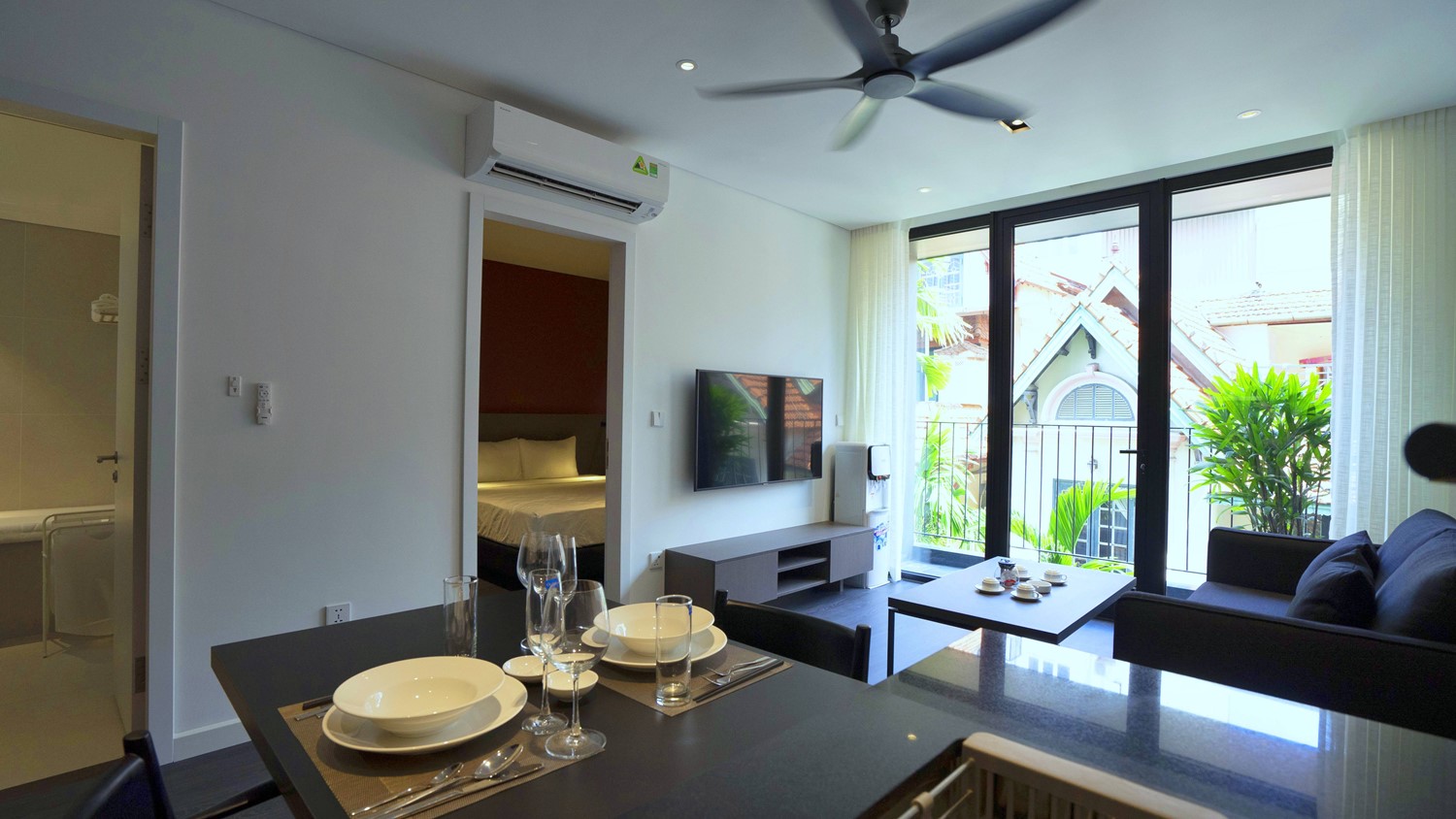 This beautifull apartment in Tay Ho is located on the 4th floor of our new building - Hanoi Housing 32. It has one bedroom, one bathroom, and an open livingroom-kitchen. Let me introduce each space of this apartment. In the kitchen, the cooking equipment and furniture is set up next to the kitchen sink which is attached to the counter height dining table. Both cooking and dining sets are selective from high-quality brands. For the living room, you're offered a sofa with comfortable softness and size, a smart TV with multiple channles, and a wall phone charger. Next, in the bathroom, you can relax in the bathtub and adjust exact temperature with the advanced shower faucet. Then, in the bedroom, we provide you a handy wardrobe with safe box, hairdryer, iron, ironing board ladder and power outlet combined inside. It even has small gaps to allow air circulation to avoid humidness. The bed has mattress with great comfort as it is designed to reduce sinking and sagging. The spotlight nightlamps are independent and space saving. Plus, wall phone chargers are right at hand. Moreover, the Daikin ACs set up in both the livinng room and the bedroom are modern, with cooling and heating, air-purifier and quiet running. We also set the AC in the bedroom in a nice position to not face the bed, all for your health. Large double glazed windows aim for noise reduction and energy saving, equipped with double layer curtains to still allow light but avoid extreme brightness. The wooden floor is scratch resistant and brings to the apartment a tidy appearance.