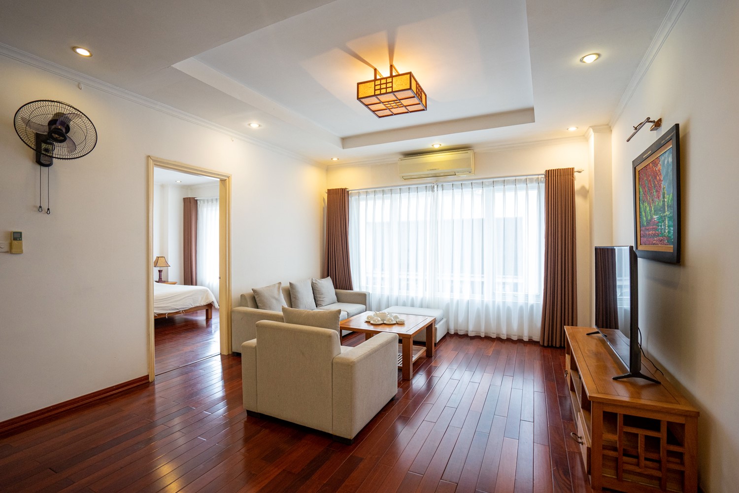 The fully furnished and equipped apartment in Tay Ho includes 2 bedrooms and 2 bathrooms. Each bedroom has a double bed. One bathroom has a standing shower and one has a bathtub.The open kitchen is fully equipped with modern equipment and a dining table with 6 chairs. The open living room area has comfortable high-quality furnishings. It is also attached with a pretty balcony where you can relax with a drink. The whole apartment has wooden floor, which brings it a neat appearance as well as gives you warmth in winter and reduces heat during summer time.