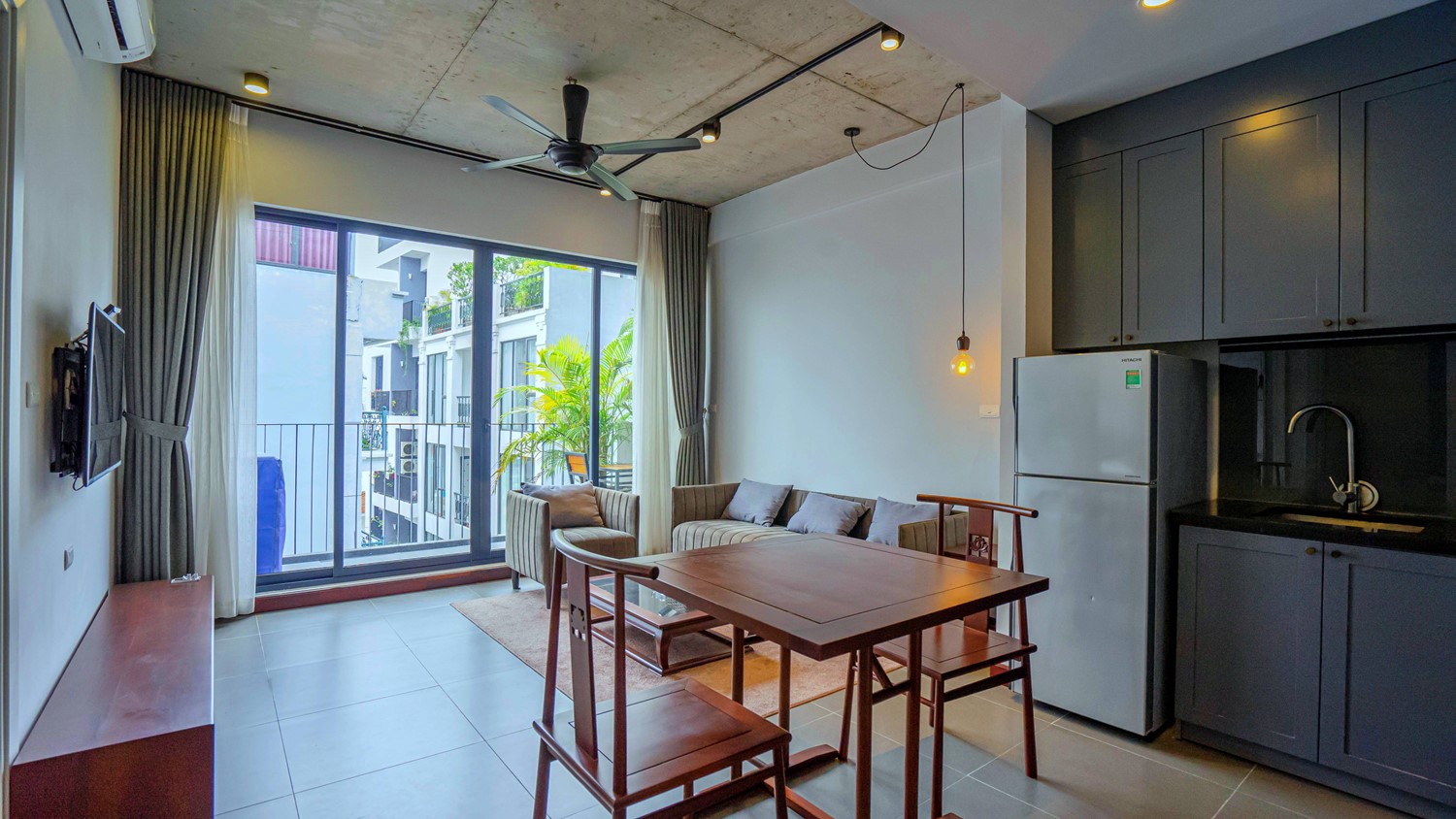 This is a beautiful apartment for rent is located in Tu Hoa, just a few steps to West Lake. It has modern design. The total living space is 55 sqm consisting of a bright living room, open kitchen and dining area, 1 bedroom with a comfortable bed where you can relax after a hard-working day and 1 bathroom with bathtub and standing shower.