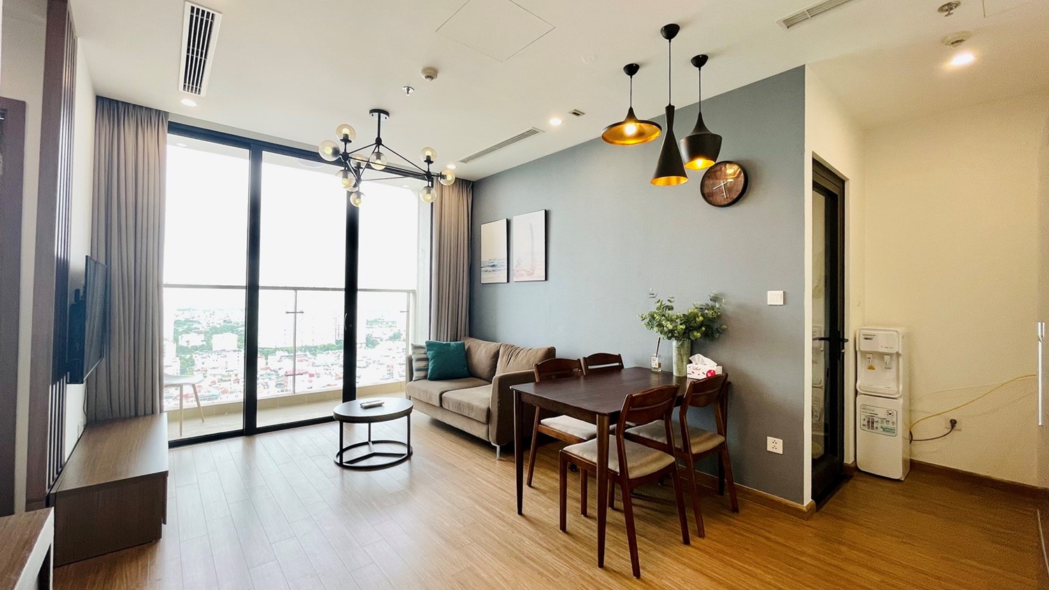 Step into a realm of refined urban living with this expansive 2-bedroom condo at Vinhomes Skylake. Spanning 103 sqm on a high floor, this residence offers sweeping panoramic views of Hanoi’s skyline, abundant natural light, and an open-plan design that effortlessly marries style with function. The spacious living and dining area, accented by sleek modern furnishings, provides an ideal setting for both entertaining guests and relaxing in tranquility. The contemporary kitchen is fully equipped with high-end appliances and elegant cabinetry, ensuring that meal preparation is as enjoyable as it is efficient. Each of the two well-proportioned bedrooms serves as a serene retreat, featuring ample storage and refined finishes. An impeccably designed bathroom with premium fixtures completes this luxurious space.
