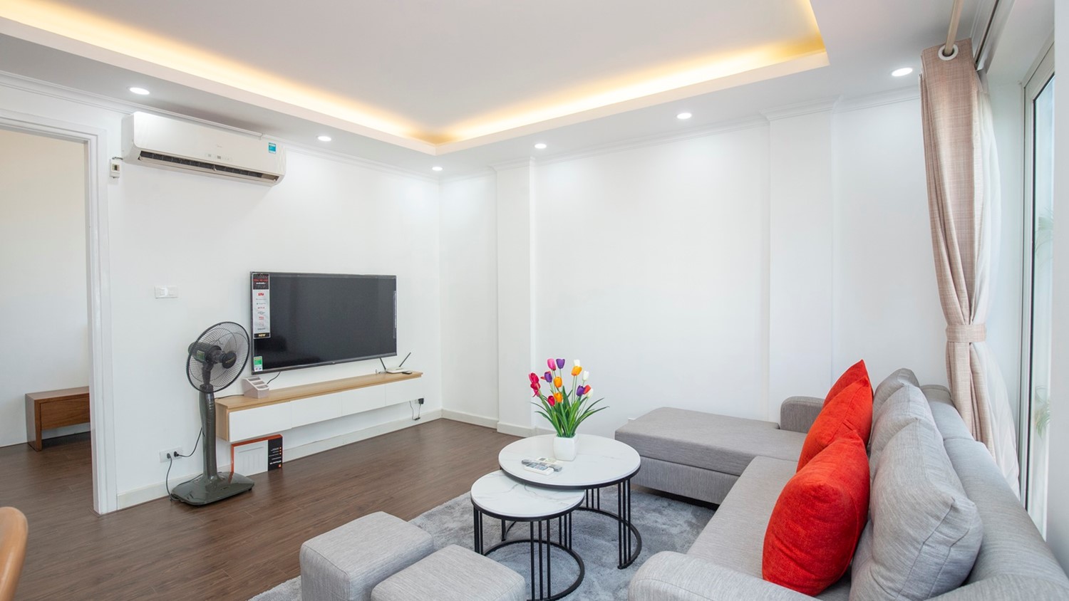 This beautiful apartment is located on Kim Ma street, near Ngoc Khanh lake, just about 500 meters from Lotte Center Hanoi. It is on the 6th floor, the total living area is up to 65 sqm, designed with 1 bedroom, 1 bathroom, provided fully with furniture and equipment.