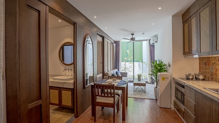 The kitchen is equipped with modern appliances and stylish finishes. The bedroom, a peaceful sanctuary, is designed with a low-profile platform bed and rattan sliding doors.