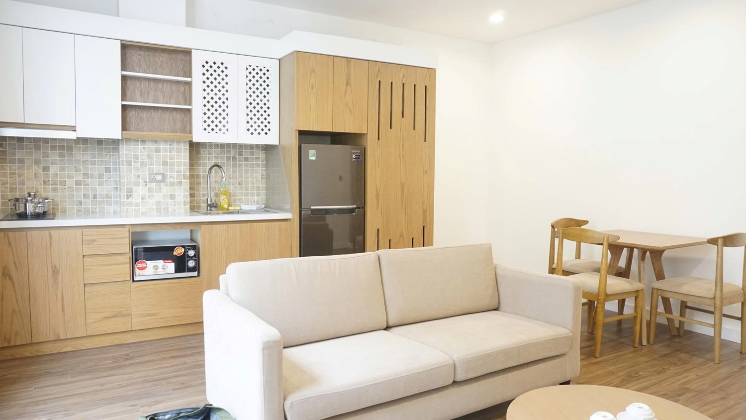 • Well-Appointed Kitchen: Features a compact yet functional layout with induction and electric cooktops, electric oven, full refrigerator, and cooking set—great for light daily cooking.