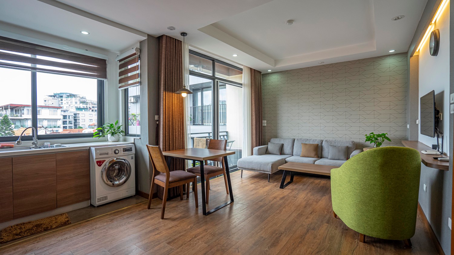 This charming 1-bedroom apartment for rent on Tay Ho Street, right in the heart of the lovely Tay Ho area, is a great place to live – comfy and convenient in a fun, lively neighborhood. It's about 45 square meters, and the layout is really well done, making the most of the space and giving you some privacy. There's a separate bedroom – perfect for chilling out – and the modern bathroom has a standing shower. The whole place is furnished with cool, contemporary stuff, so it feels stylish and welcoming. The kitchen has everything you need, whether you're a whiz in the kitchen or just want to whip up a quick breakfast.