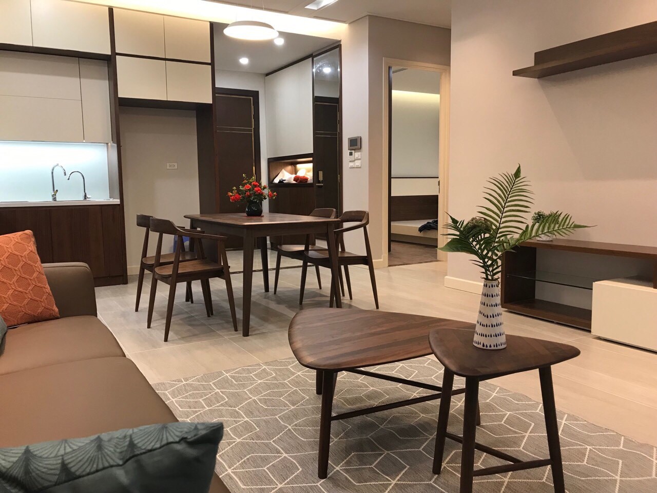 This 2-bedroom apartment located in Sun Grand City Thuy Khue is designed in a modern and sophisticated style, offering a comfortable and convenient living space. The living room stands out with a high-end brown sofa, combined with a compact coffee table in a minimalist style. The space is harmoniously arranged, with a warm lighting system from modern ceiling lights, creating a cozy and luxurious atmosphere. The living room is also integrated with a dining area, featuring a natural wood dining table for four, suitable for family meals or gatherings with friends. The shelving system is designed to be built-in, optimizing space while also being highly aesthetic. The bedroom is equipped with a large bed and a wardrobe in warm wood tones, combined with the gentle white of the furnishings, creating a comfortable and relaxing resting space.