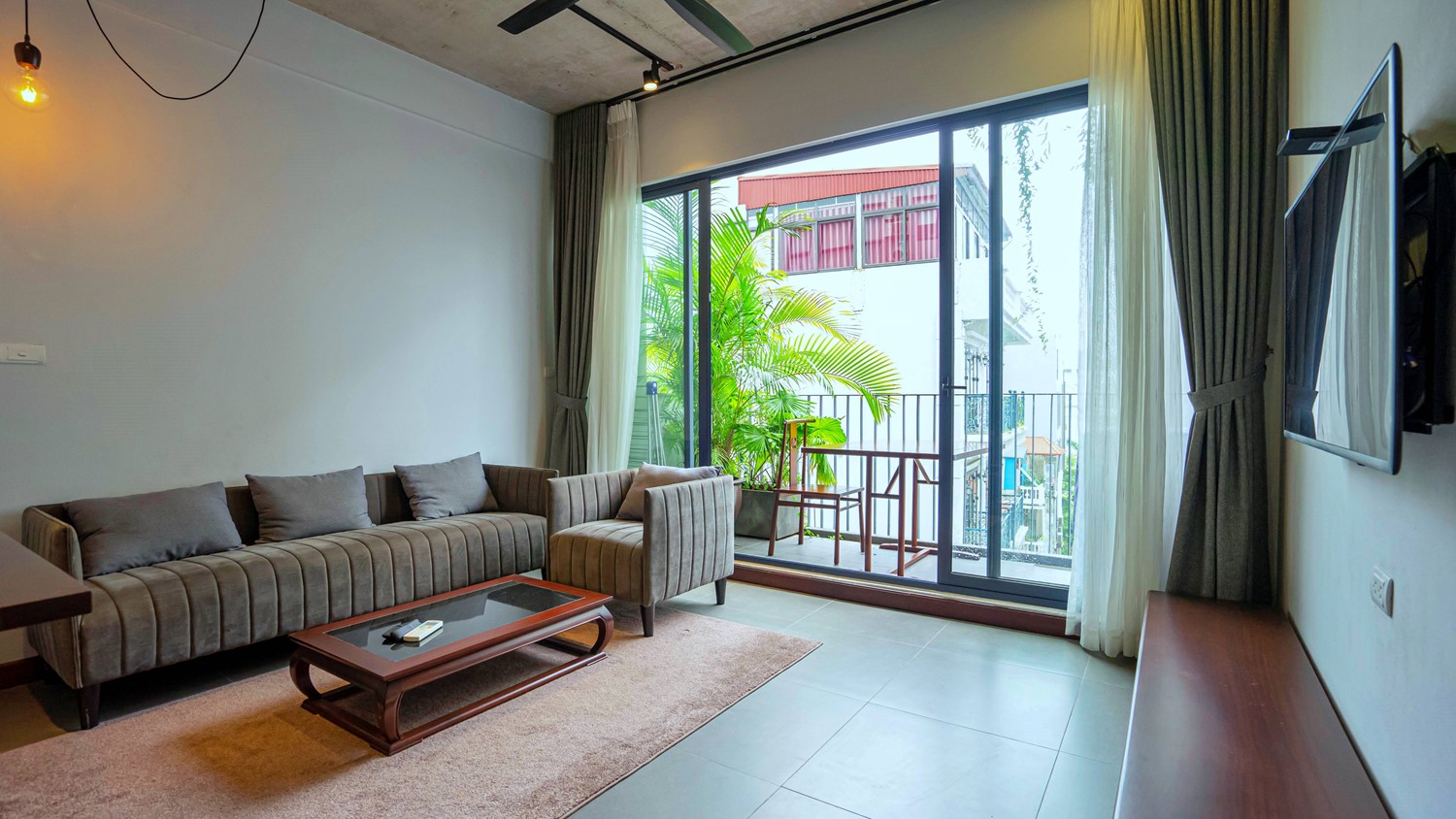 The living room is filled with natural light, thanks to floor-to-ceiling sliding glass doors that open onto a private balcony. A cozy sofa set with a matching armchair and coffee table creates a welcoming space to unwind, entertain guests, or enjoy a quiet evening with a book. The balcony adds a touch of greenery and outdoor freshness, making the room feel even more open and inviting.