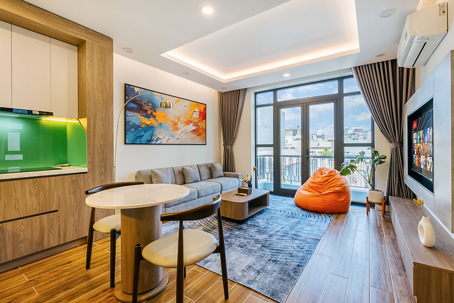 This charming 1-bedroom apartment for rent on Tay Ho Street, right in the heart of the lovely Tay Ho area, is a great place to live – comfy and convenient in a fun, lively neighborhood. It's about 45 square meters, and the layout is really well done, making the most of the space and giving you some privacy. There's a separate bedroom – perfect for chilling out – and the modern bathroom has a standing shower. The whole place is furnished with cool, contemporary stuff, so it feels stylish and welcoming. The kitchen has everything you need, whether you're a whiz in the kitchen or just want to whip up a quick breakfast.