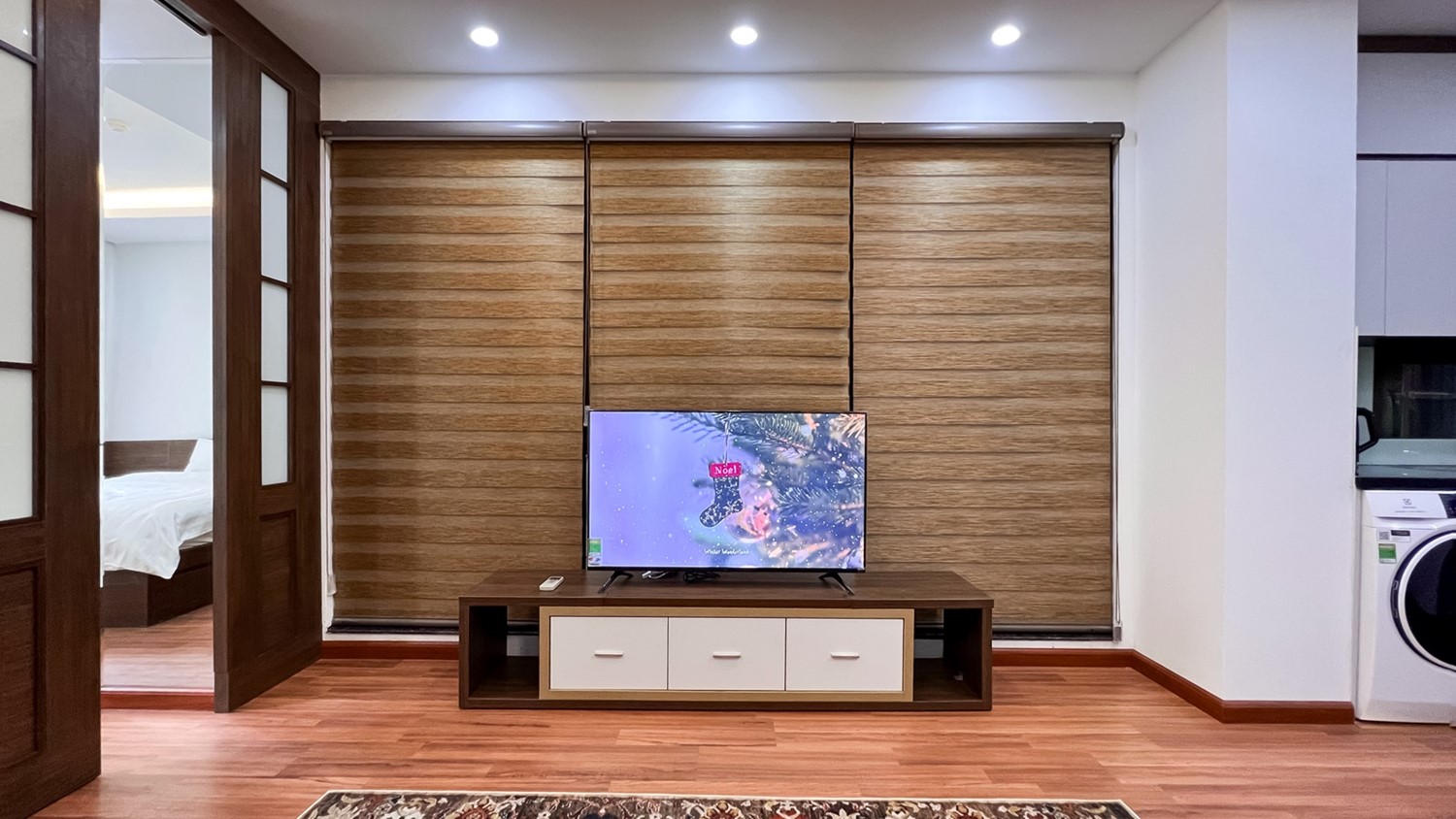 The apartment features a warm, modern interior with wooden flooring, soft lighting, and a comfortable living area that flows seamlessly into a compact dining space. Large windows with blinds provide privacy while still allowing natural light to brighten the space.