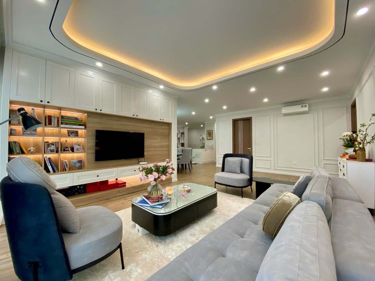 • Spacious Living Room: The open-plan layout connects a comfortable lounge area with a large smart TV and a stylish built-in display cabinet. Warm lighting and ceiling detailing elevate the living experience.