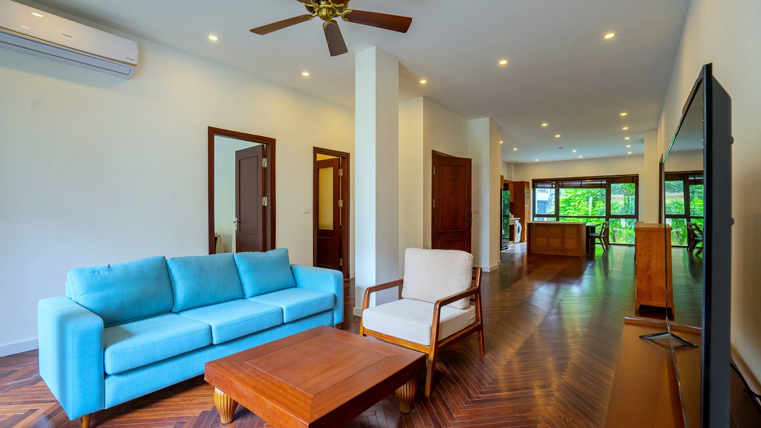 The apartment features four well-proportioned bedrooms, where most are thoughtfully designed with access to balcony space, allowing for plenty of fresh air and natural light throughout the day. At the center of the apartment is a bright and airy living room, seamlessly connected to a spacious open-plan kitchen and dining area. The room is highlighted by a stylish accent blue sofa and matching cushion set, creating a modern yet cozy ambiance perfect for entertaining guests or enjoying family time.