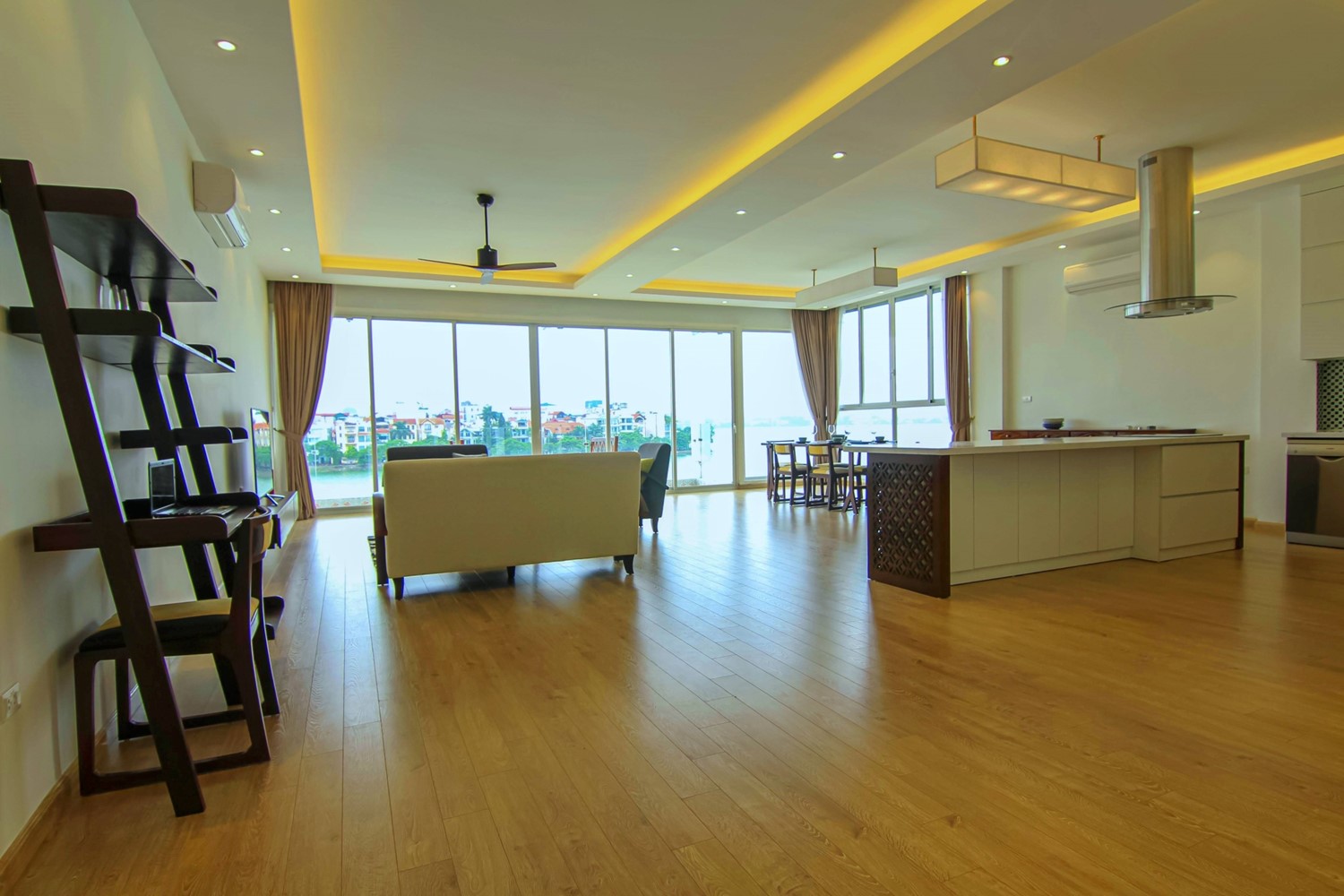 This stunning apartment is on the top floor in a 4-storey building located right at the front of the lake in Tay Ho, Hanoi. Very spacious with living space of 220 sqm consisting of open livingroom, kitchen & dinning area, 3 bedrooms, 3 bathrooms, big balcony overviewing the lake. The apartment is fully furnished and equipped in a modern style with high quality standard furniture. The kitchen features diswasher, oven, and microwave.