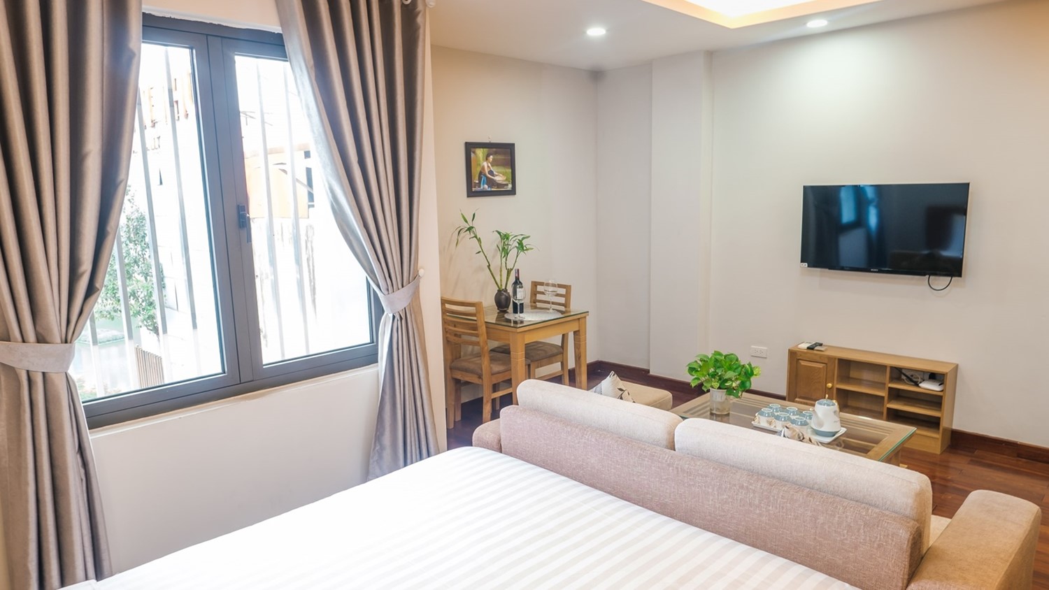The apartment boasts a cozy layout, featuring a comfy bed, with a luxurious bathtub, and a stylish living area. The traditional interior design, adorned with exquisite local artwork and handcrafted furniture, creates a warm and inviting atmosphere. Large windows offer breathtaking views of Ngoc Khanh lake, allowing you to soak in the vibrant energy of Hanoi.
