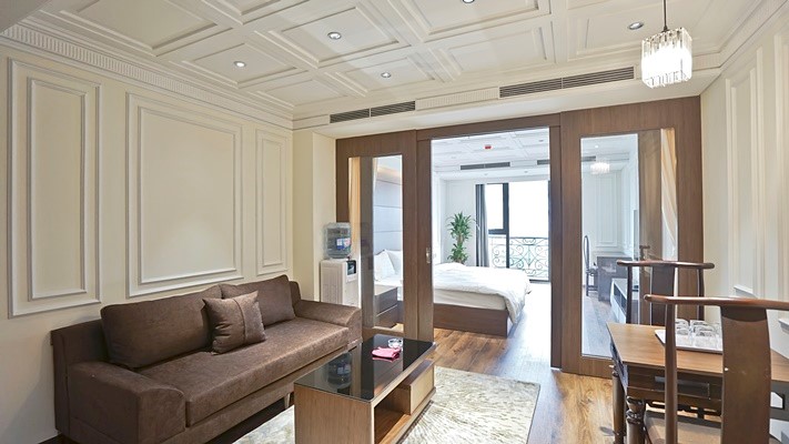 This modern and cozy 1 bedroom apartment for rent is located in Hai Ba Trung district. Quiet location and close to many restaurants, cafes, shopping malls, etc. It comes with 55 sqm, the apartment is designed with 1 bedroom, 1 bathroom, and a nice living room combined with an opened layout kitchen and a balcony.