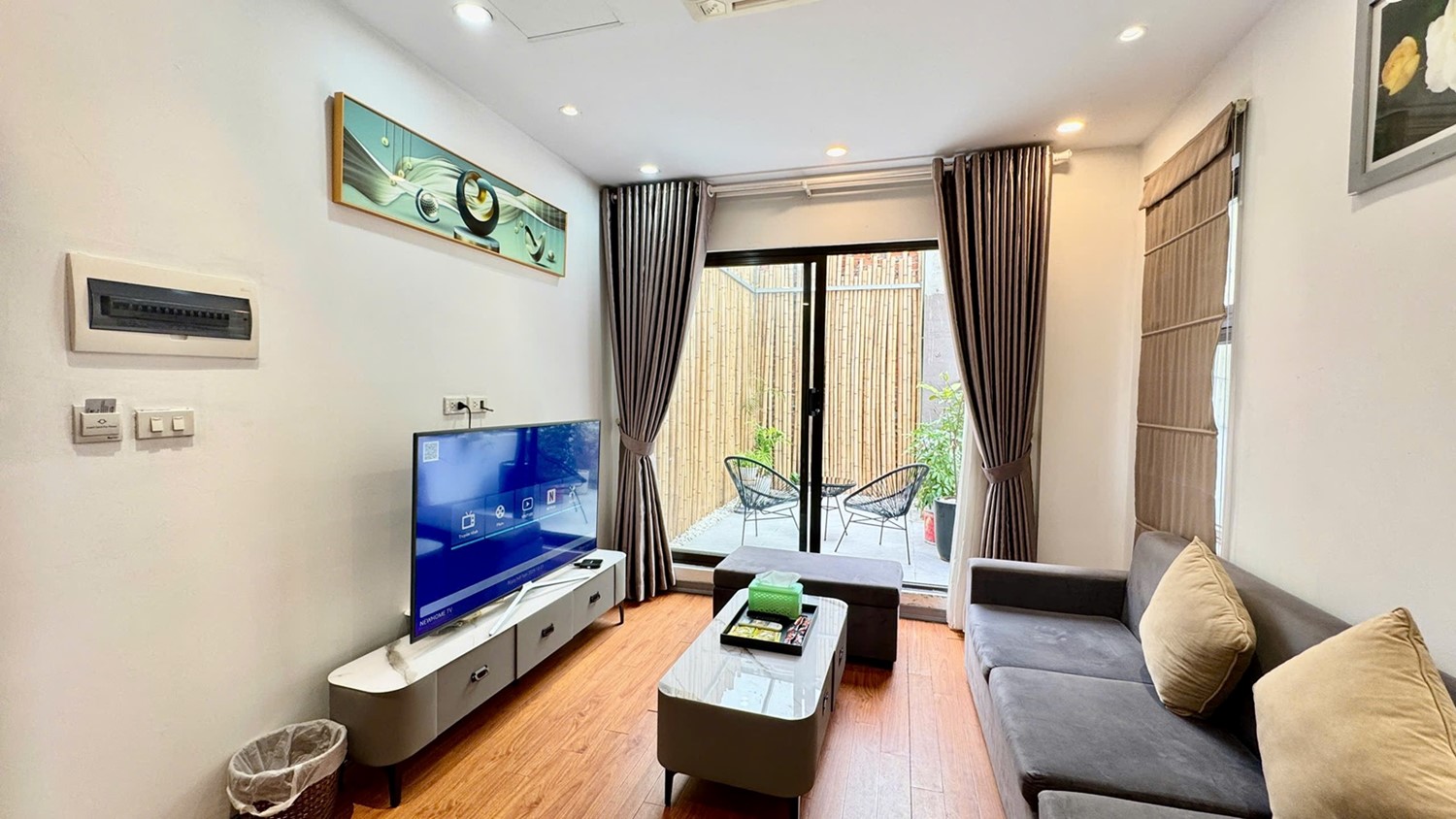 Stylish Living Area: Open-plan space with sofa set, LCD TV, and direct access to a private balcony and small garden patio—perfect for morning coffee or evening unwinding.