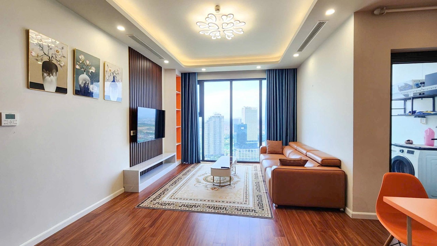 The apartment features a spacious living room with floor-to-ceiling windows, allowing plenty of natural light and offering open city views. High-quality finishes, modern lighting and warm wooden flooring creat an elegant yet cozy atmosphere.