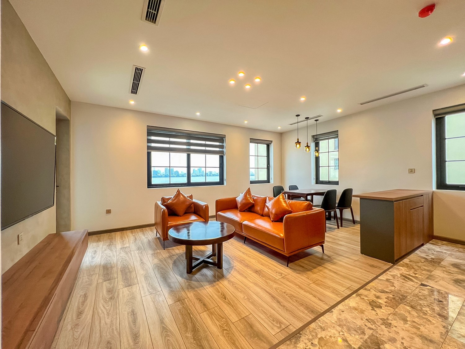 The unit features integrated LED ceiling lights that provide bright, energy-efficient illumination throughout, complementing the sleek, minimalist aesthetic. A centralized air conditioning system ensures consistent, optimal cooling across the entire space, maintaining a pleasant atmosphere no matter the season. The spacious open kitchen layout is both stylish and functional, equipped with top-of-the-line appliances, including a built-in dishwasher—a rare treat and uncommon household appliance in Hanoi’s rental market. This addition brings an extra layer of convenience, making everyday tasks easier and more efficient. The bedrooms are thoughtfully designed with built-in closets in neutral wood tones, offering ample storage space while maintaining a warm, inviting feel. The use of these subtle wood accents enhances the apartment’s modern charm while ensuring the living spaces remain organized and clutter-free. This apartment combines practical living features with stylish, high-end finishes, making it a standout choice for anyone seeking an elevated rental experience in Hanoi.