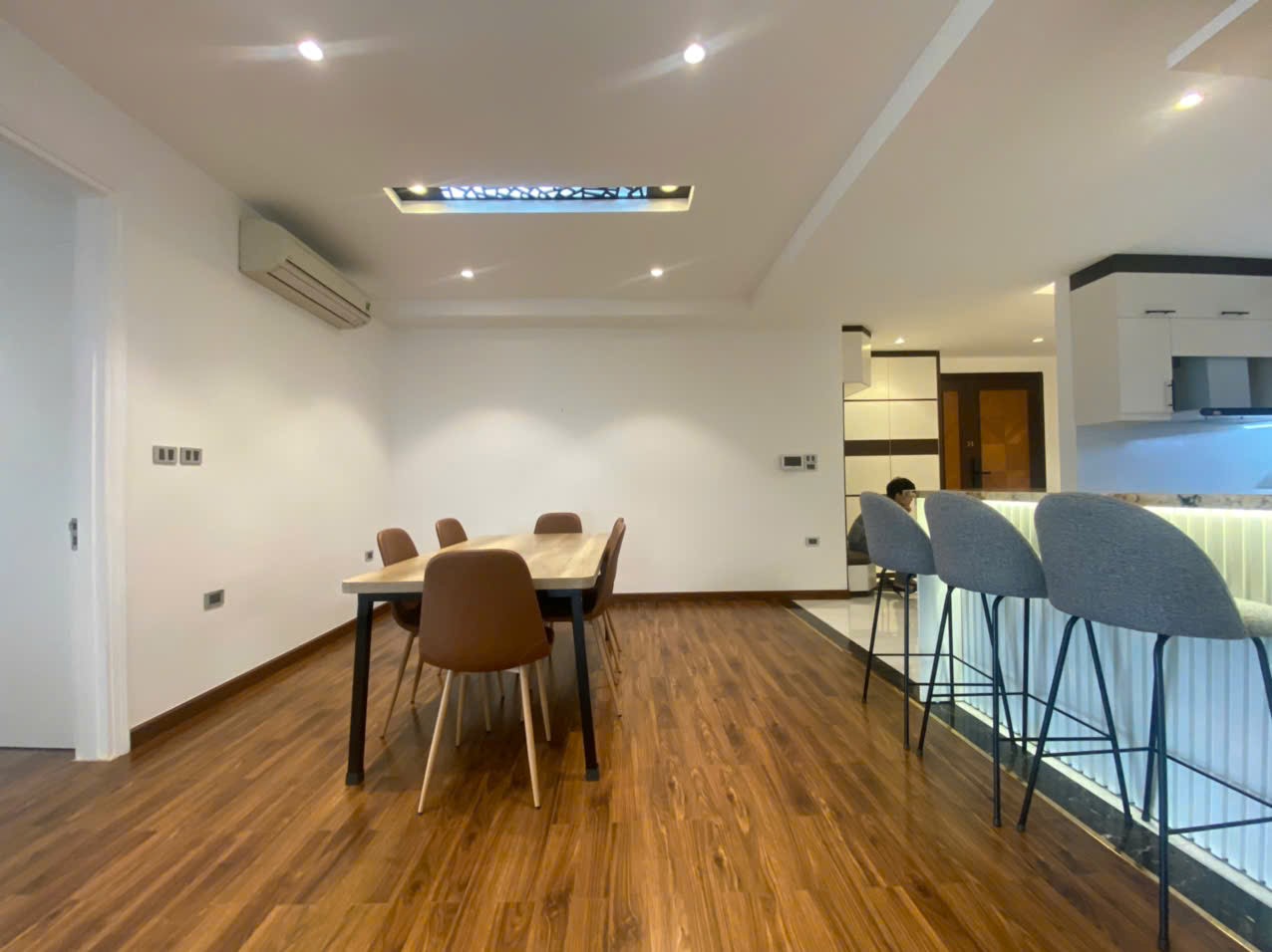 The apartment features a large living and dining area with rich wooden flooring, enhanced by recessed ceiling lighting and wide glass doors leading to a private balcony with open urban views. The space feels bright, airy, and well-proportioned - perfect for both everyday living and entertaining.