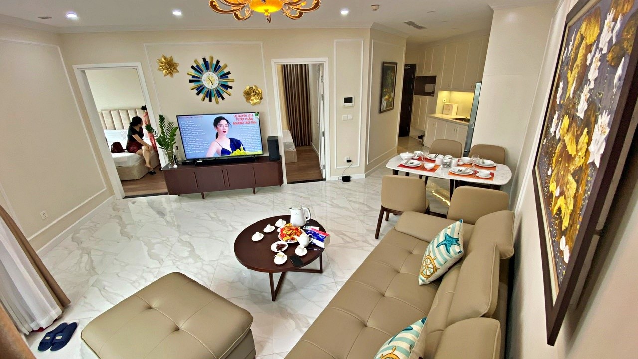 This spacious 91m² apartment is located in the sought-after D' El Dorado complex, situated at the intersection of Lac Long Quan and Nguyen Hoang Ton St. in Tay Ho. The apartment boasts a central and convenient location, offering easy access to all the amenities and attractions of the area. With its unique curved layout, the apartment stands out for its signature design and modern appeal.