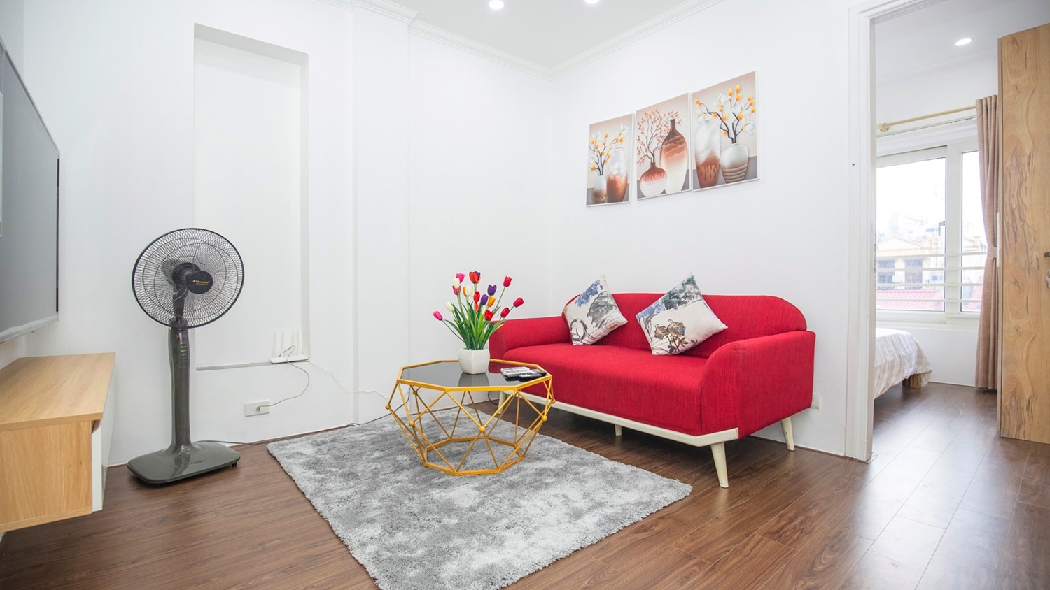 This beautiful apartment is located on Kim Ma street, near Ngoc Khanh lake, just about 500 meters from Lotte Center Hanoi. It is on the 6th floor, the total living area is up to 65 sqm, designed with 1 bedroom, 1 bathroom, provided fully with furniture and equipment.