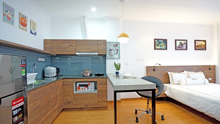 This charming apartment for rent is located on Thi Sach street in the vibrant Hai Ba Trung district, offering an inviting atmosphere that’s hard to resist. It boasts an open view and a cozy ambiance that elevates your living experience. With a total living area of 45 sqm, this beautifully designed apartment features 1 comfortable bedroom and a modern bathroom, making it perfect for singles or couples.