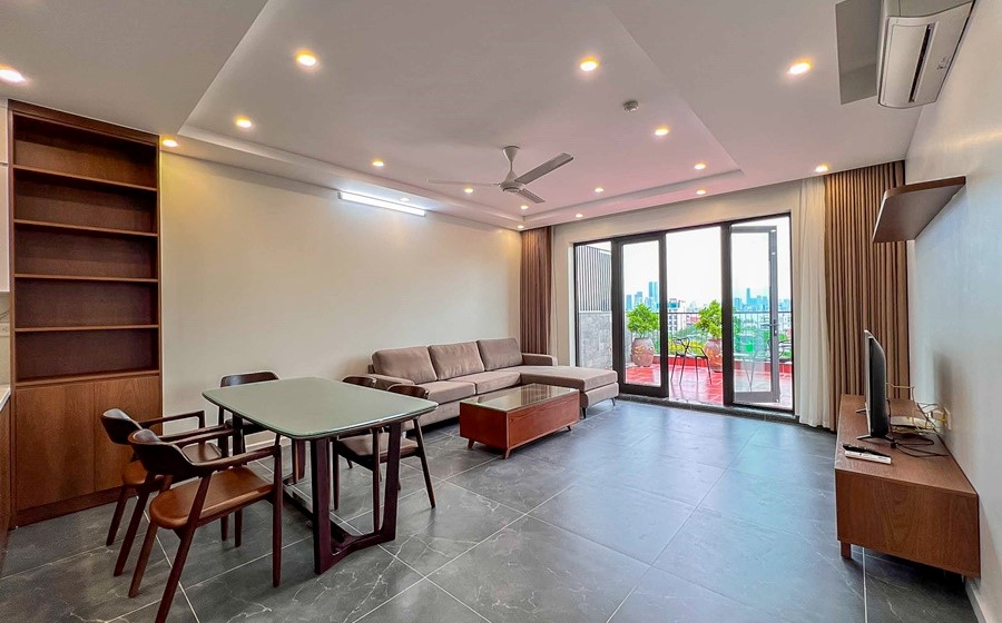 Modern apartment for rent at Nghi Tam street, Tay Ho, Hanoi with an area of 80m², located on the 6th floor of the building. The apartment includes 1 bedroom and 1 bathroom, fully equipped with furniture and appliances, bringing convenience and comfort to tenants.