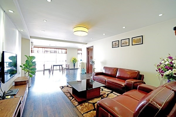 This spacious two-bedroom apartment is located in the heart of Hoan Kiem, offering a perfect blend of comfort and modern style. The living area is thoughtfully designed, featuring a deluxe leather sofa set that adds an elegant touch and provides ample seating for relaxation or entertaining guests. The open-plan layout creates a seamless flow between the living space and the rest of the apartment, enhancing the sense of space.